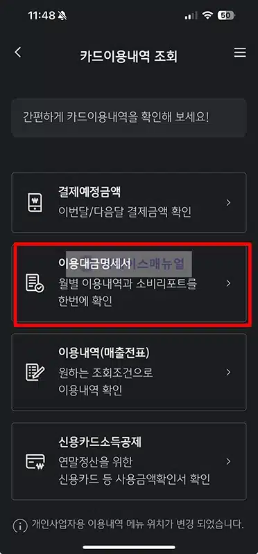 스마트폰에서 카드사 앱을 통해 손쉽게 연회비를 확인할 수가 있습니다. 대부분 이용대금명세서 항목에서 확인이 가능합니다. 각 카드사 마다 메뉴명이 다르기 때문에 이 부분은 직접 확인을 해야 하며 KB 국민카드 기준으로 소개를 하자면 다음과 같습니다.