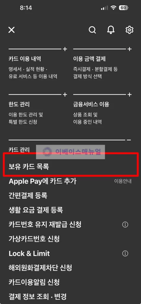 현대카드 앱을 실행합니다. 그리고 로그인 상태에서 오른쪽 상단에서 ☰를 클릭합니다. 그러면 전체 메뉴가 나오는데요. 여기에서 카드 관리 > 보유 카드 목록을 선택합니다.