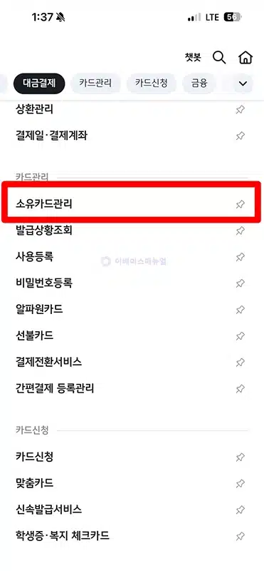 1. KB Pay 앱을 실행하고 전체 메뉴 > 카드관리 > 소유카드관리를 클릭합니다.