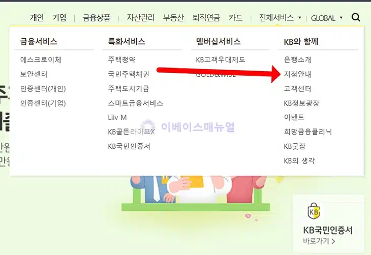 2. 홈페이지 상단 메뉴에서 전체서비스를 선택 후 나오는 KB와 함께 아래에 지점안내를 클릭합니다.