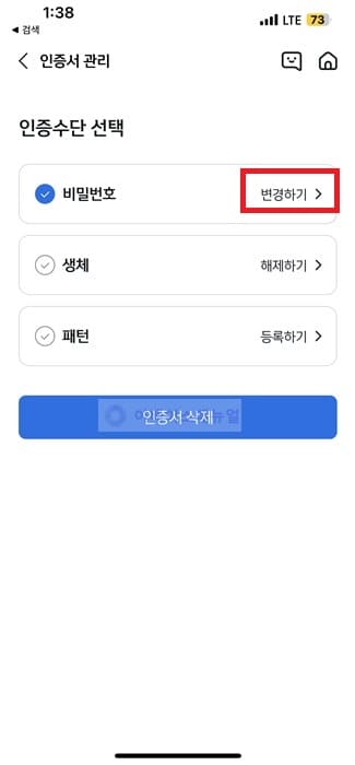 인증수단 선택 화면에서 비밀번호 변경하기를 클릭합니다. 그리고 현재 비밀번호 새로운 비밀번호를 입력하면 인증서 비밀번호 변경이 완료가 됩니다.