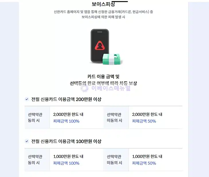| 피싱 사고 | 최대 2,000만원 | 카드론·현금서비스 등 금융거래에서 보이스피싱 피해 발생 시 보상 (선택약관 동의 시 최대 2,000만원, 미동의 시 1,000만원 한도) ※ 전월 카드 이용 금액 100만원 이상 시 혜택 제공 |