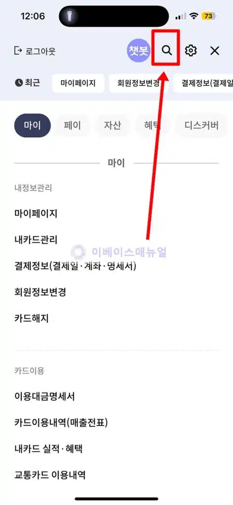전체 메뉴를 보면 챗봇 옆에 검색 버튼이 있습니다. 클릭합니다. 그리고 나서 검색창에서 혜택정보 수신동의를 검색 후 메뉴를 클릭합니다.