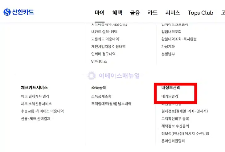2. 로그인 상태에서 오른쪽 위에 ☰를 누르고 내정보관리 > 내카드관리를 클릭합니다.