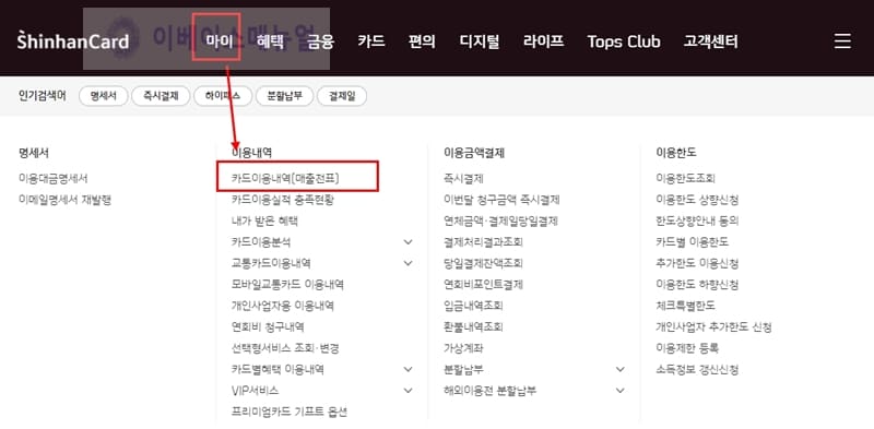 로그인 이후 상단에 마이페이지 마이 메뉴를 선택후 이용내역 아래에 위치한 카드이용내역[매출전표]를 클릭합니다.