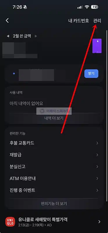2. 토스뱅크 체크카드 화면에서 오른쪽 위 우상단에 위치한 관리를 클릭하세요.